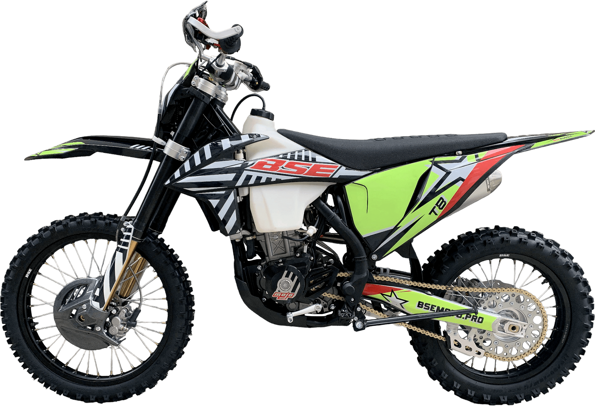 На T8 установлен топливный бак на 8 л, мощная тормозная гидравлическая система с дисками диаметром 240 мм, звезды 13t – 49t, «зубастые» покрышки Carrystone 80/100-21 спереди и 100/90-18 сзади. Мотоцикл оснащается полностью светодиодной фарой головного света, грипсами и ручкой газа Nibbi Racing, цепкой шкуркой сиденья и защитой переднего тормозного диска.