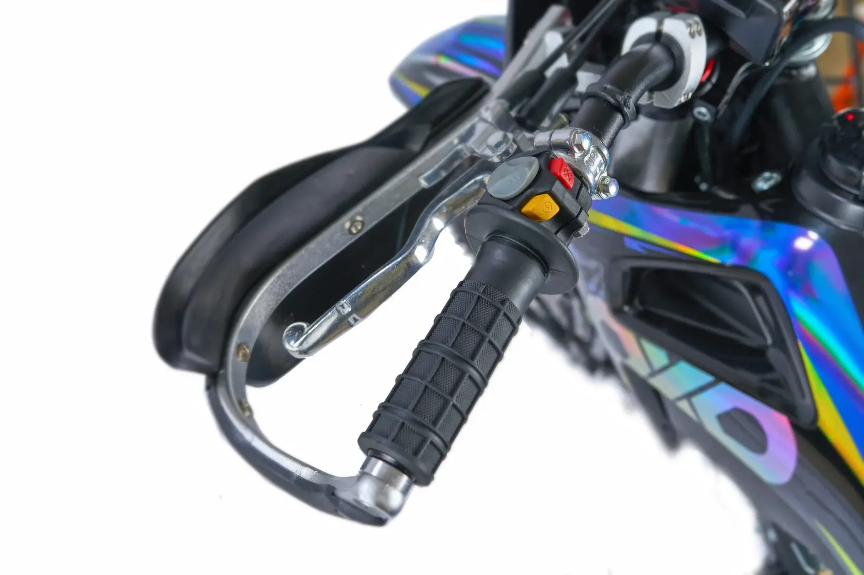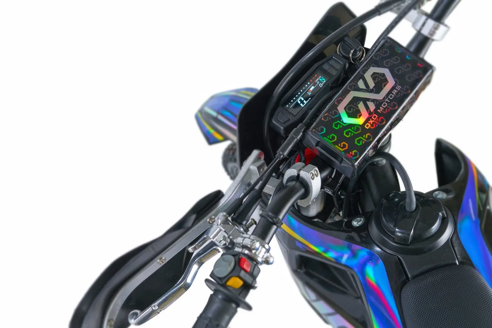 Важная часть современного эндуро мотоцикла - усиленный руль переменного сечения. На руле установлен рычаг заслонки подсоса. Алюминиевая ручка газа с коротким ходом имеет регулировку троса. Также мотоцикл укомплектован электронной панелью приборов.