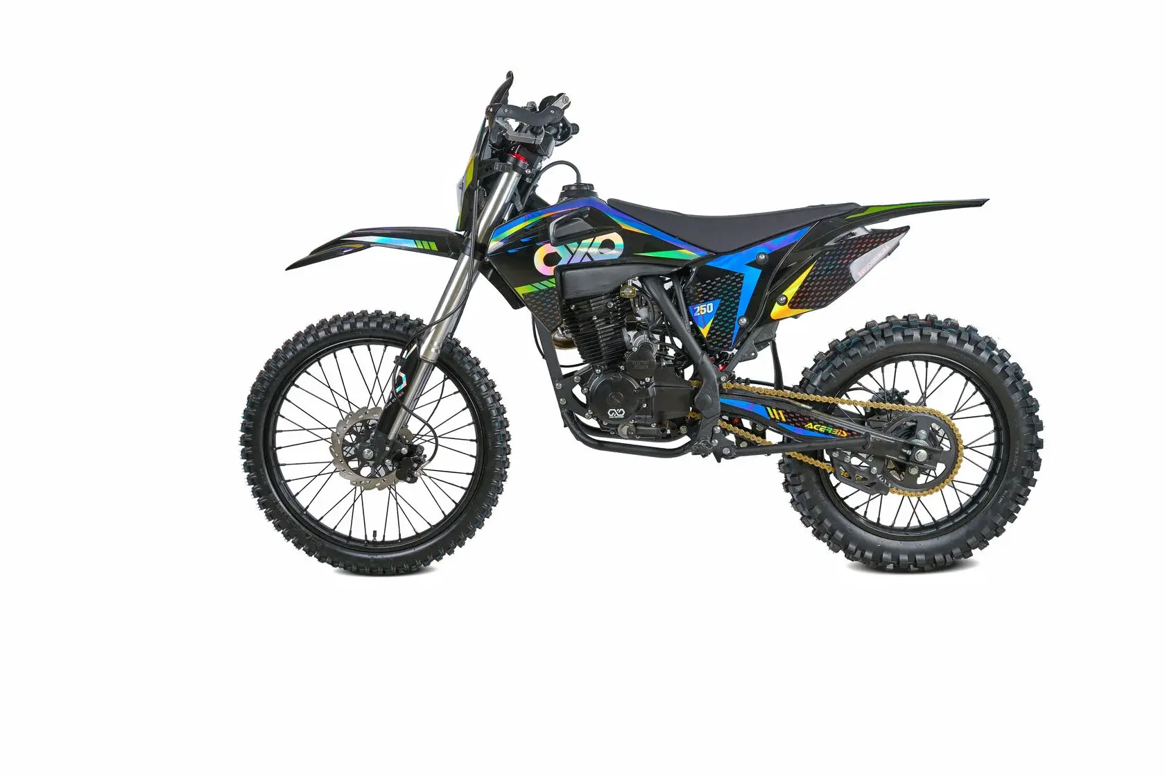 Размер передней покрышки: 80/100-21. Размер задней покрышки: 120/100-18. Они прекрасно себя ведут по песку и грязи, что позволяет райдеру отлично показать себя на пересеченной местности.