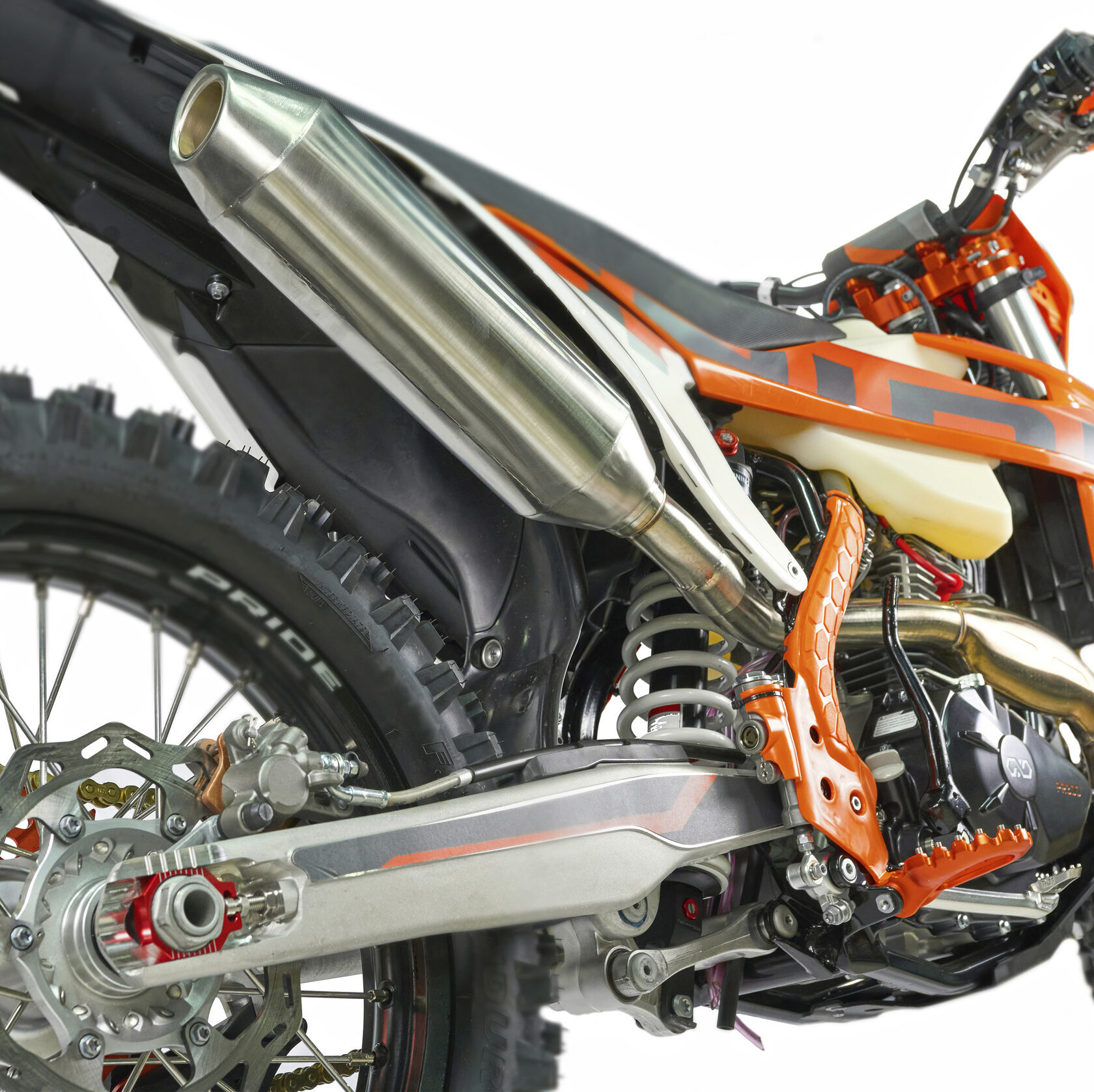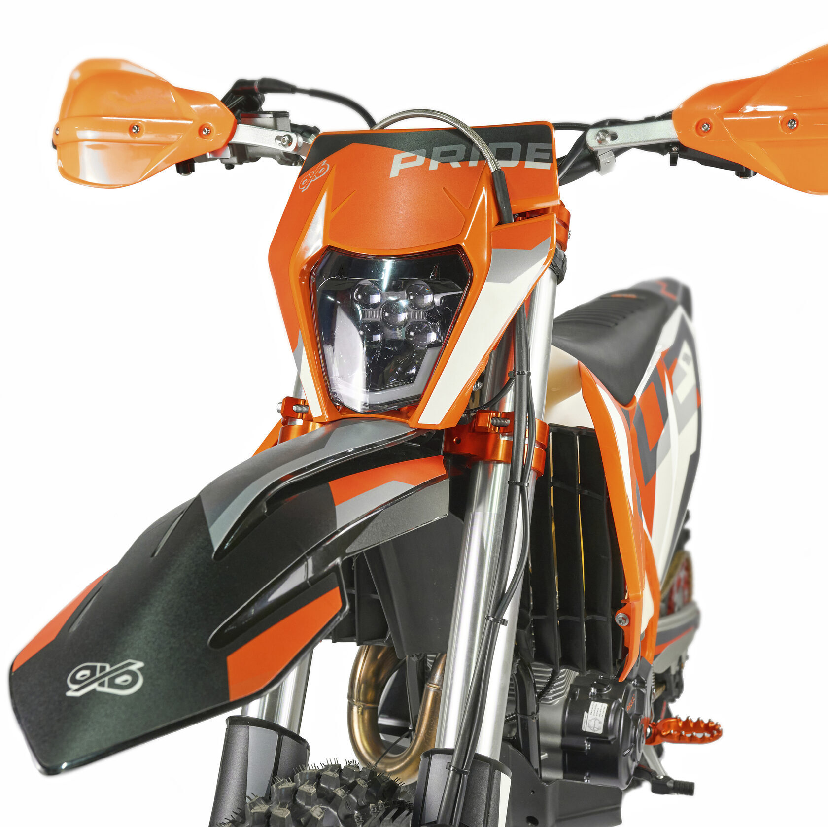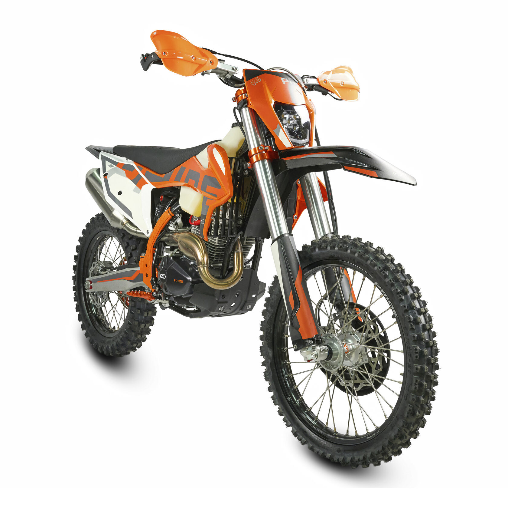 Электронная приборная панель, противоскользящее сиденье, защита рамы от протирания ботинками, подножки «AJ1» (алюминий 6063 с шипами), подножка боковая «AJ1» (алюминий 7075-Т6), невозгораемый воздушный фильтр «AJ1» – Twin Air с увеличенной площадью, ведомая звезда «AJ1» (520, алюминий 7075-Т6), защита рук, грипсы OTOM/Lock-On, передние и задние буксаторы «AJ1», откидные алюминиевые рычаги 270°, алюминиевая лапка КПП, пульт света КТМ, LED фара 5 линз, моточасы, фрезерованная траверса X trig