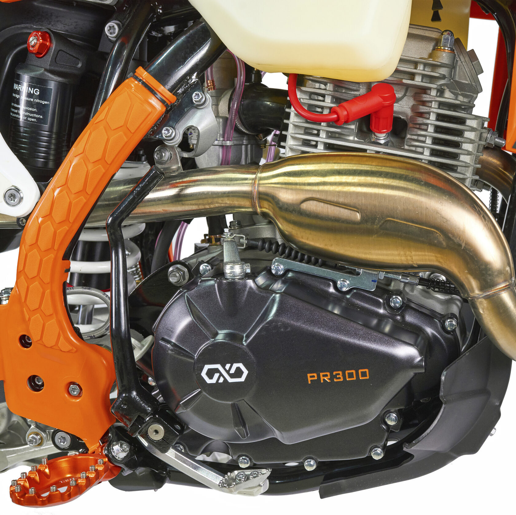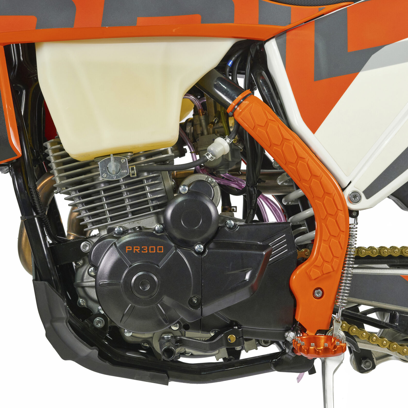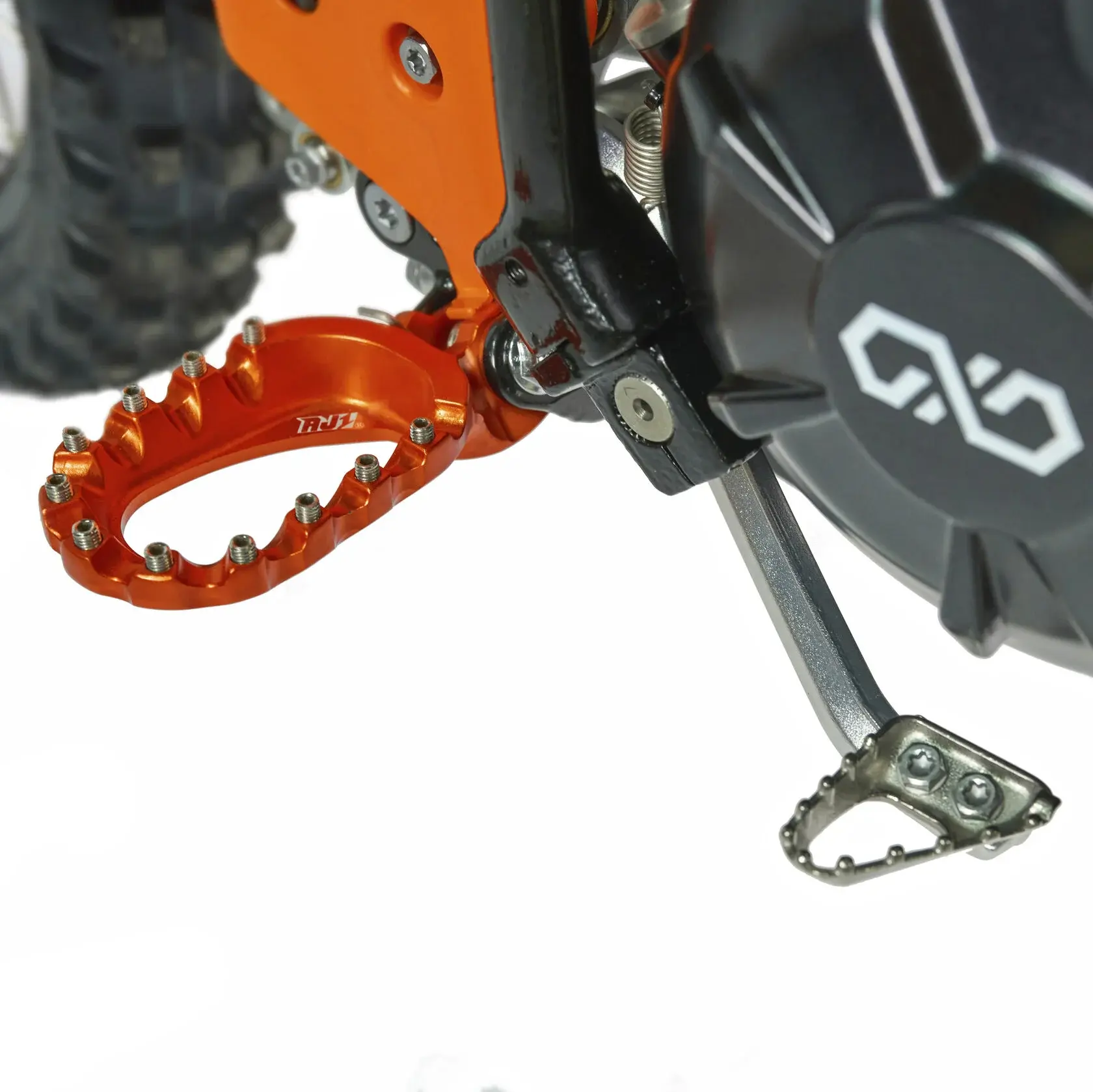Электронная приборная панель, противоскользящее сиденье, защита рамы от протирания ботинками, подножки «AJ1» (алюминий 6063 с шипами), подножка боковая «AJ1» (алюминий 7075-Т6), невозгораемый воздушный фильтр «AJ1» – Twin Air с увеличенной площадью, ведомая звезда «AJ1» (520, алюминий 7075-Т6), защита рук, грипсы OTOM/Lock-On, передние и задние буксаторы «AJ1», откидные алюминиевые рычаги 270°, алюминиевая лапка КПП, пульт света КТМ, LED фара 5 линз, моточасы, фрезерованная траверса X trig