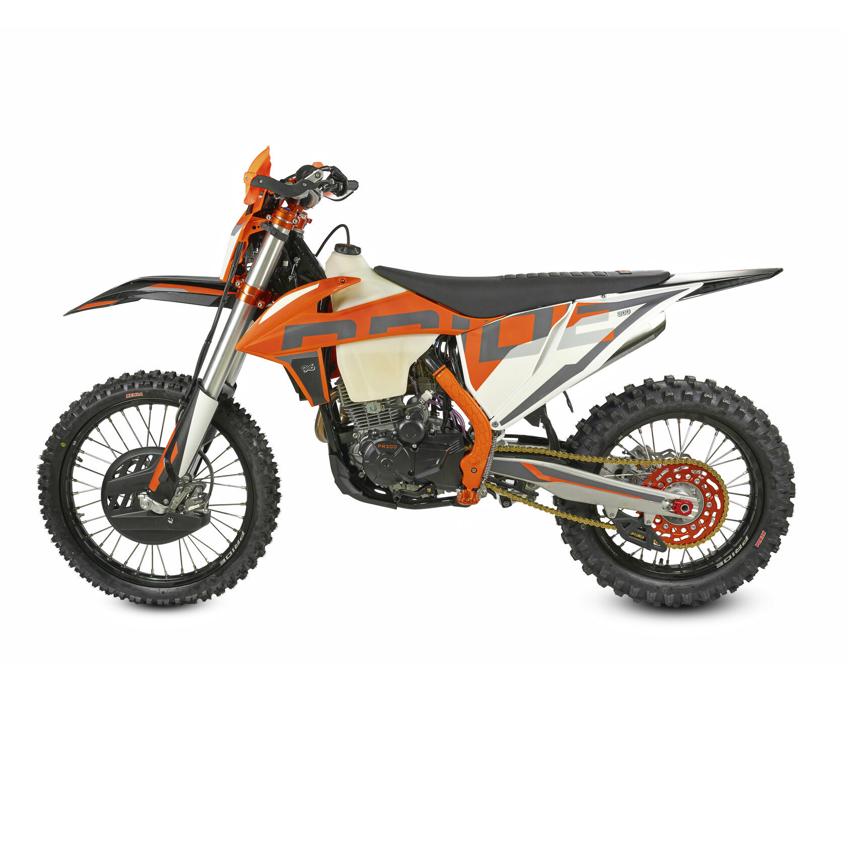 Спереди и сзади установлены антибуксаторы бренда "AJ1", которые притягивают покрышку к ободу, позволяя ездить по бездорожью при низком давлении в камерах, не давая покрышке проворачиваться во время езды. Размер передней покрышки: 80/100 R21. Размер задней покрышки: 120/90-R18. Модель комплектуется "жирной" резиной "KENDA". Все эти характеристики позволяют мотоциклу отлично себя чувствовать в песке и грязи.