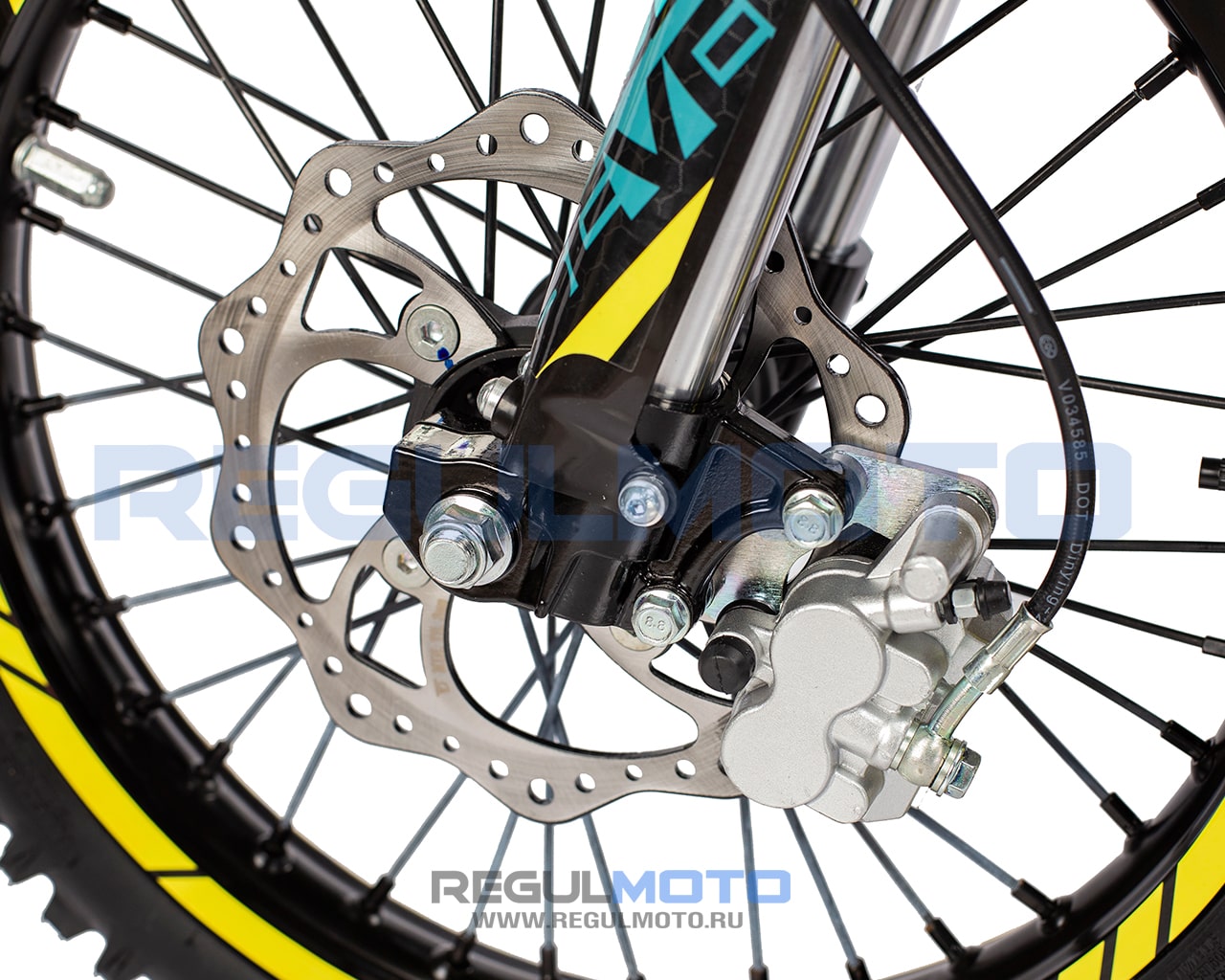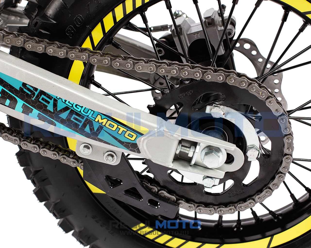 Подвеска Regulmoto SEVEN собрана на высококачественных комплектующих известного бренда KKE. Здесь применяется традиционное для данного класса мототехники конструктивное решение: передняя вилка перевернутого типа и маятниковый рычаг с моноамортизатором. Несмотря на отсутствие регулировок, амортизаторы легко справляются со всеми сценариями использования техники. Среди других особенностей функционал и подбора комплектующих модели нужно отметить следующее: