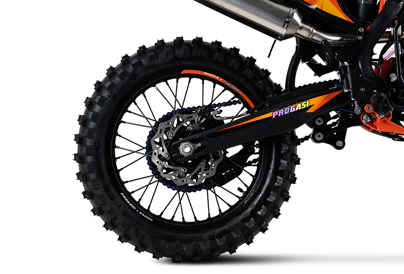 Усиленные алюминиевые обода PROGASI оборудованы буксаторами, которые притягивают покрышку к ободу, не давая ей проворачиваться во время езды. Также применяются усиленные ступицы, которые сделаны из единого куска алюминия, что создает максимальную прочность конструкции. Покрышки Kenda давно зарекомендовали себя в экстремальных видах спорта. На PROGASI применятся самая злая и зубастая резина. Она прекрасно себя ведет по грязи и песку, а также выдерживает закручивание шипов для катания зимой и отлично показывает себя на пересеченной местности.